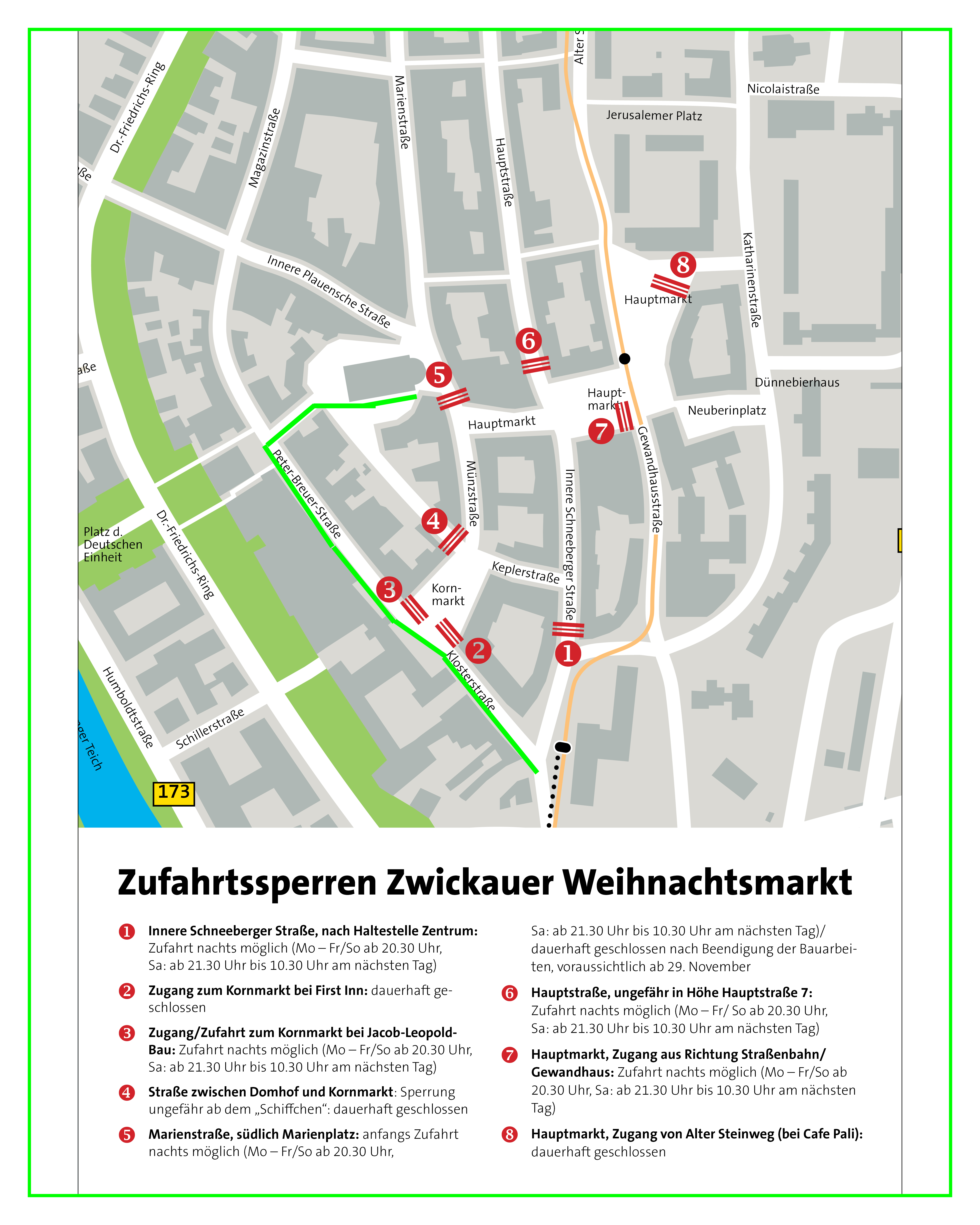 Aufgrund der Sicherheitsmaßnahmen ist für die Dauer des Weihnachtsmarktes (bis 22.12.) eine direkte Anfahrt zum Robert-Schumann-Haus Zwickau nicht möglich.