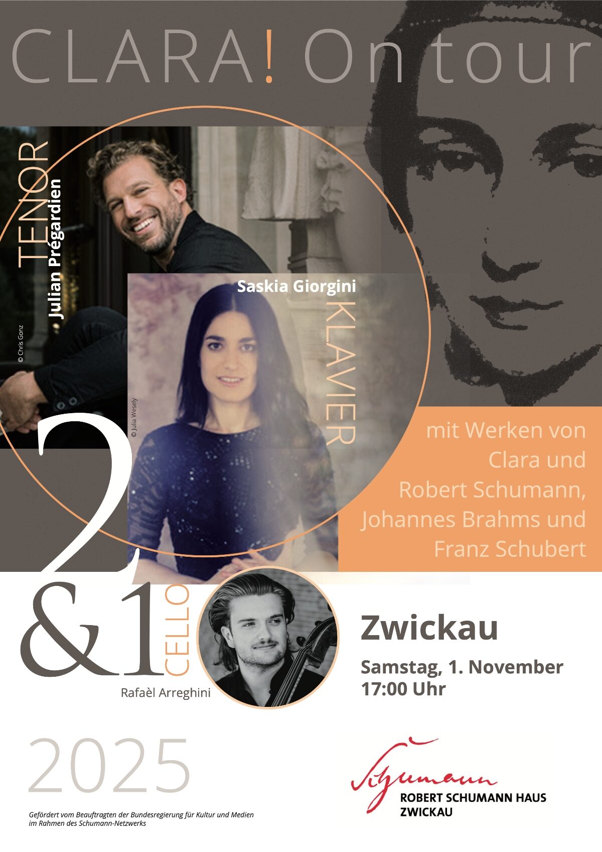 In einem neuen Großprojekt CLARA! On tour, initiiert von Julien Prégardien, übernehmen Pianistinnen Originalprogramme Clara Schumanns und bringen diese zusammen mit anderen Mitwirkenden auf die Bühnen. Den Auftakt macht am Samstag, 1. November 2025 um 17 Uhr im Robert-Schumann-Haus Zwickau die italienische Pianistin Saskia Giorgini zusammen mit Tenor Prégardien. Als Gastmusiker wirkt der französische Cellist Raffaèl Arreghini mit. Auf ihrem Programm stehen Werke von Clara und Robert Schumann, Johannes Brahms und Franz Schubert. Das Konzert findet als Kooperationsprojekt von vier Schumann-Städten (Zwickau, Leipzig, Düsseldorf und Baden-Baden) innerhalb des vom Beauftragten für Kultur und Medien der Bundesregierung geförderten Schumann-Netzwerks statt.